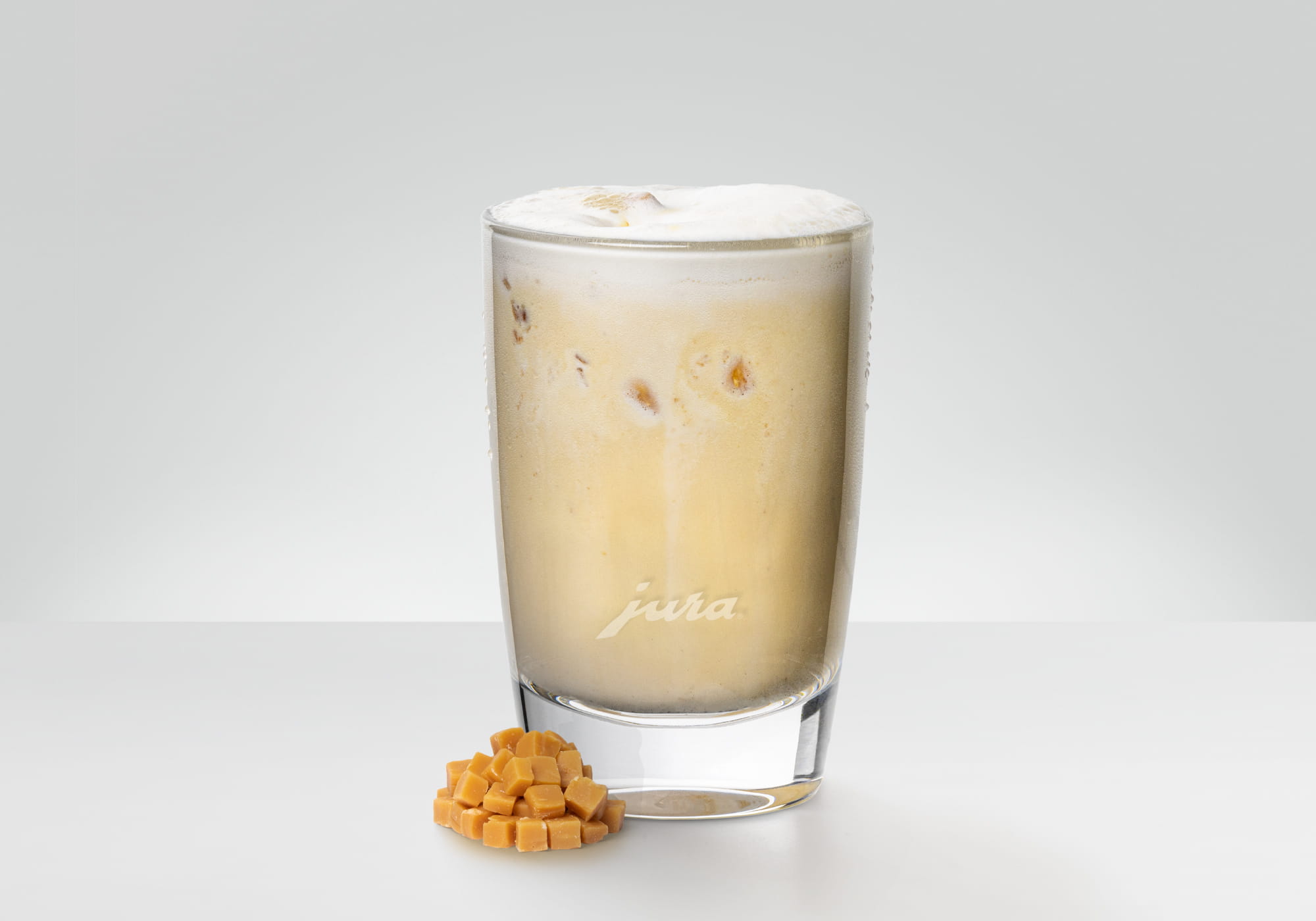 • Tome un vaso para Latte Macchiato pequeño y añada dos bolas de helado de caramelo salado y almendras.